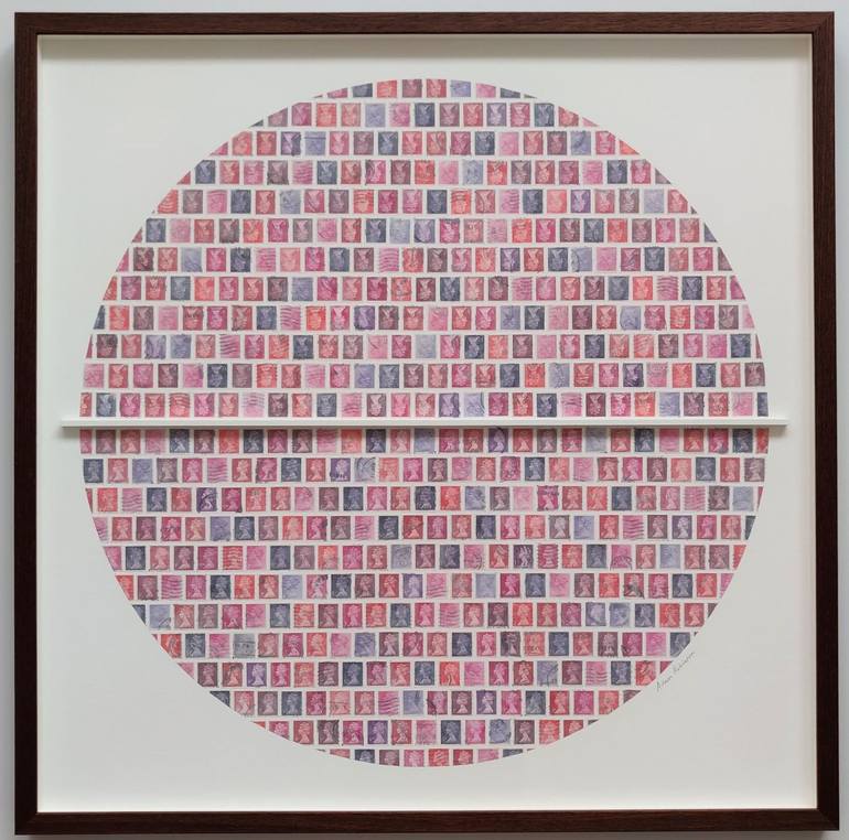 A collection of original, vintage postage stamps altered with a light coating of paint and arranged around a strip of wood. The work is mounted behind conservation glass within a dark brown, wooden frame. Collected from a variety of sources, these Queen Elizabeth II stamps have been laid out in a g...