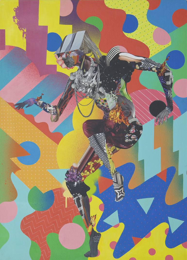 Made for a group exhibition themed "Heat" To win the sexual selection to cause "heat" with female, ability of dancing is very beautiful primitively and energetic. This piece is inspired by nature phenomenon. Collage, Acrylic, Marker, Ballpoint on Canvas