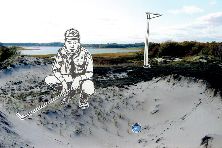 Sand Trap, Color Photograph & Vintage Paper Illustration Collage, 4x6in. 11x14 white mat and modern wood frame, Signed on back. Photograph is taken by artist.