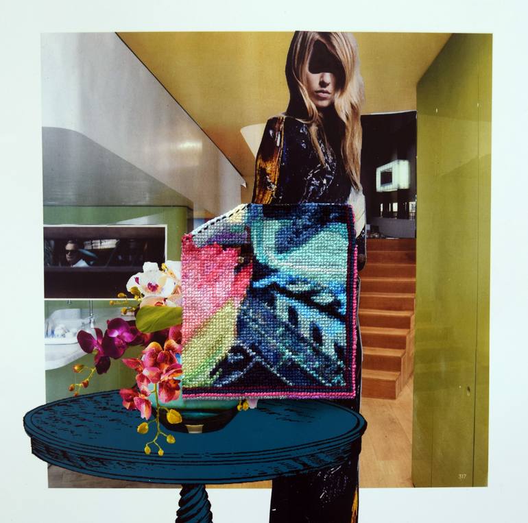 A mixed media commentary on the 'male Gaze' in film and fashion. Created before the Harvey Weinstein scandal emerged but all the more relevant because of it. The piece plays with the juxtaposition of digital media and a traditional 'Woman's craft'. The print elements are printed onto 210 gsm Fujifi...