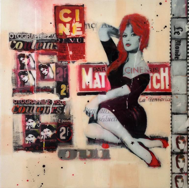 As an artist, writer and actress, Nora Novak creates vibrant, stylized and seductive mixed media photo-based collage style paintings that explore a visual world of pop culture,pin-ups,fashion,cinema and music. Intrigued by contrast, Novak blends color and imagery overlays using collage, acrylic and spray paint on panel. with a resin finish.