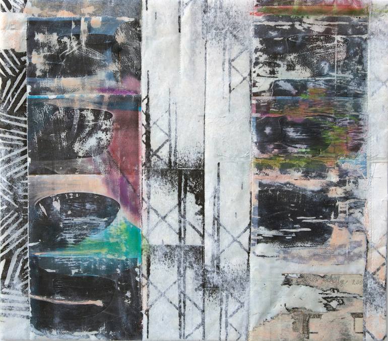 1936 Chicago, Illinois USA, studios in San Francisco and Sunnyvale, California. Lecture and teach internationally. In The Fresno Art Museum, California, awarded Schulze the Council of 100's Distinguished Woman Artist for 2017 with catalog and exhibition "CELEBRATING 80-Joan Schulze" Produced 2 reference books: The Art of Joan Schulze, 1999 and Poetic License-The Art of Joan Schulze, 2010; 2 catalogs: QUILTS:Joan Schulze; iQuilt iDraw-The original fiction of Joan Schulze; 3 poem books, most recent 2017 "In-between". About the artist: Schulze began to make art seriously in 1970. These early works were stitched and embroidered and her first collage explorations. Beginning with her first quilt in 1974, Schulze altered purchased fabrics dyeing (60s and 70s), painting and Xerox transfer (80s), photography and photocopy (70s), digital technology (90s) including an ongoing fascination with direct and glue transfer processes (80s to present). While her interest in technology continues, Schulze's main theme is poetry: the poetry of strange often surreal juxtapositions, elegant colors, eccentric surfaces and most of all, the element of surprise in theme and execution. Quilts from 2000 to 2007 reintroduce her interest in gardens while in 2009 she began to use more urban, sometimes political subjects. Other new themes: collages both paper and fabric mixed media works inspired by her tea bowl collection and interiors. Her delight in cities is best illustrated by monumental collages 3 to 4 meters wide. Schulze's favorite and most important camera is the black and white photocopy machine. Not being portable, it stays in the studio. For many years Schulze used the copier to recompose and distort photographs, printing them onto cloth and paper for quilts and collages. In the mid 90s she began to use the photocopier to create line drawings by photocopying stitched organza embroideries. This idea enlarged and invigorated her work. Simple copies of the organza embroidery were printed onto silk. Later by folding and pleating the original, Schulze layered trompe loeil drawings. Enlarged, distorted and recombined copies created more complex mysterious drawings. Editing and working with the paper copies, she pieced them to build a larger drawing. The process goes back and forth from the originals to re-composed copies until she photocopies the drawings onto silk. The prints are stitched together. Layering the pieced drawing over batting and backing it is then ready to quilt.