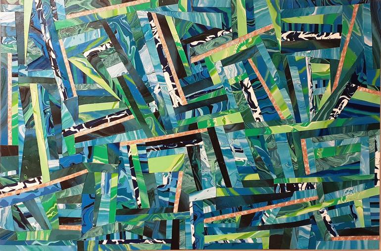 Lush slices of teal compete with rich blue-green, vibrant lime, and deep forest in a work that oozes revitalizing energy. Bursts of shimmering gold add luxurious highlights resulting in a fresh, bold painting that fits shapes together like a puzzle. A variety of different paintings are removed fro...