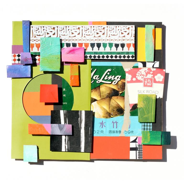 This 3D collage percolates with colours and images: that of a carved stone wall, a label from a Chinese vegetable can, bits of typography and a paper tea cup with the inscription 'Silk Road'. My use of materials is deliberately humble because I want to illustrate that art can be made with simple ma...