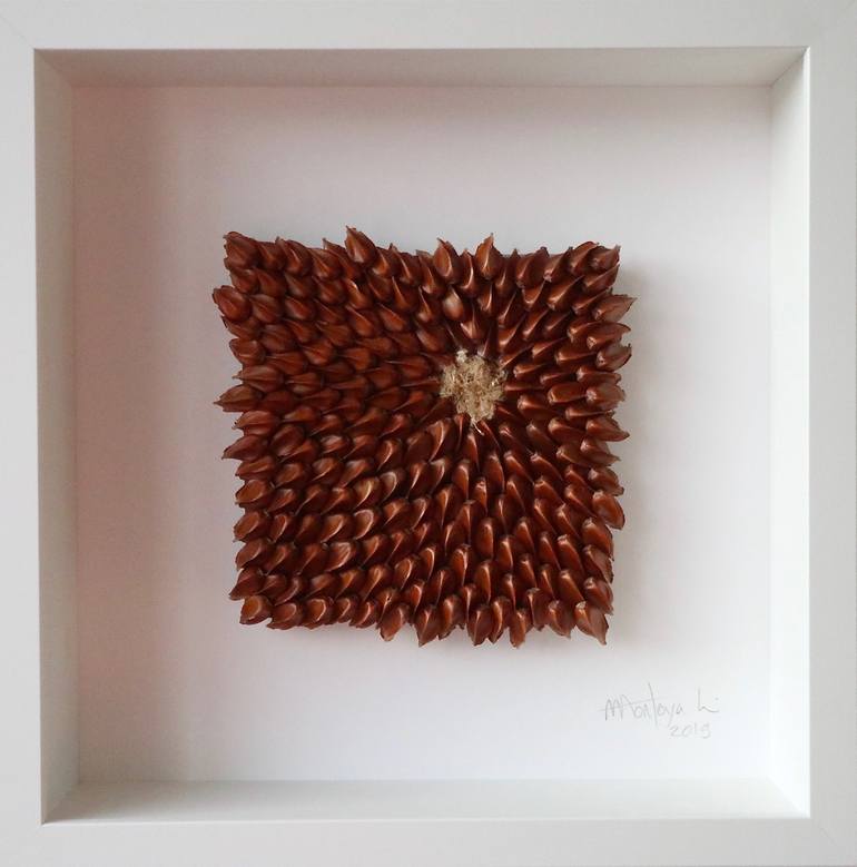 Nature provides us with complex and beautiful forms and I like to take some of those and give them a human touch by disposing pieces to make different compositions. This piece is a collage with beechmast and silk cocoons at the center.