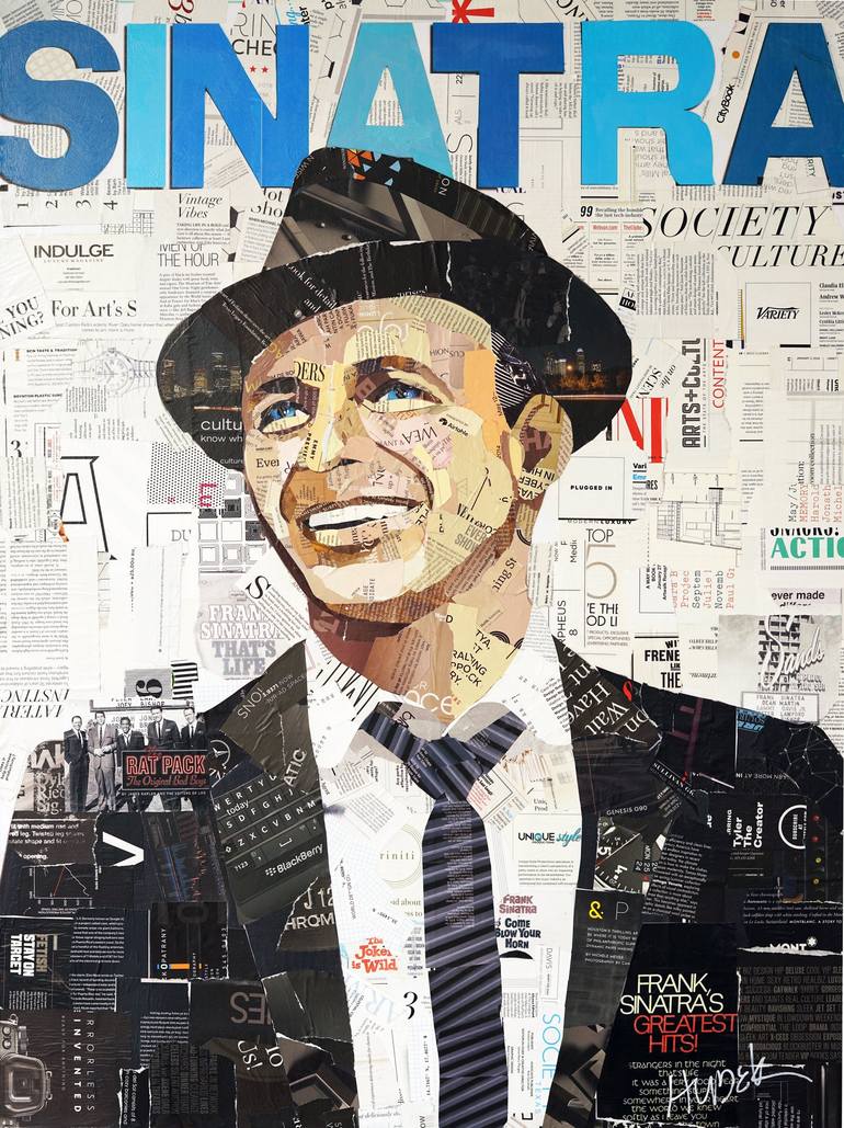 Collage made of cut and torn pages of magazines with elements of the Sinatra years used in the mix. Work is on gallery canvas with varnish coat. NOTE: MAGAZINE COLLAGE ART IS NOT RESIN COATED AND IS NOT MEANT TO BE. IT IS COATED WITH ACRYLIC VARNISH FOR PROTECTION.