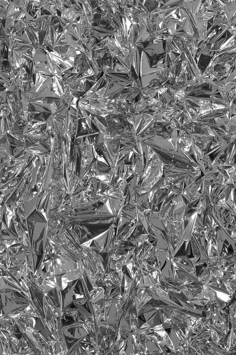 A mirror finish silver mylar contained in a crisp white shadow box frame. A silver geode for your contemporary interior. In artist's frame. Wired to hang vertically, but could also be hung horizontally. Available as prints on