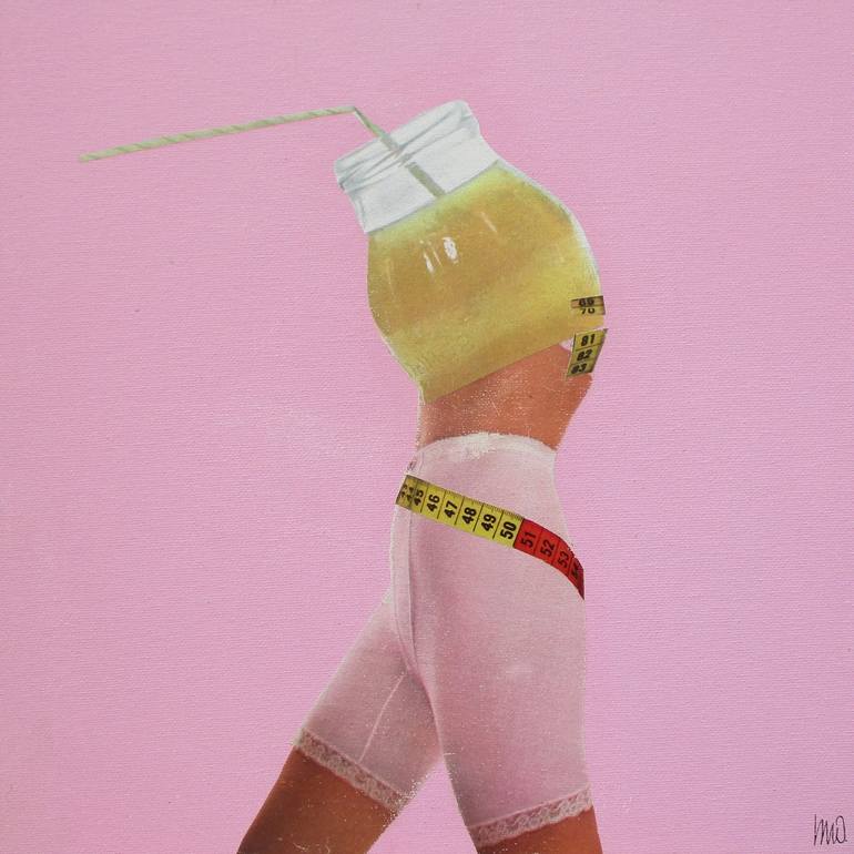 This captivating and bold work of art depicts a fusion of anthropomorphic elements and everyday objects, creating a composition that is both disconcerting and intriguing. Against a soothing pastel pink background, the artist has skillfully assembled the silhouette of a human body dressed in tight pi...