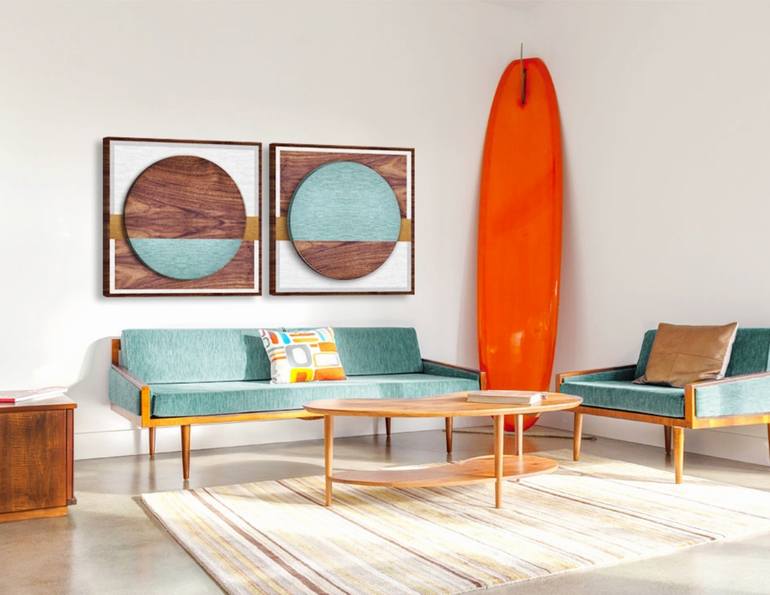 Inspired from my original contemporary artwork line, I am now introducing a more retro version of the Sun & Moon series. With the combinations of different textures, fabrics and materials, this style fits well with Mid-Century Modern themes. Sculpture Collage: Walnut Wood, Various Fabrics, Alder F...