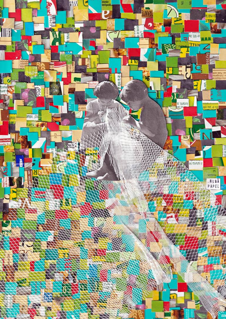 Collage on paper, cardboard and plastic. Arranged in small pieces glued and pressed.