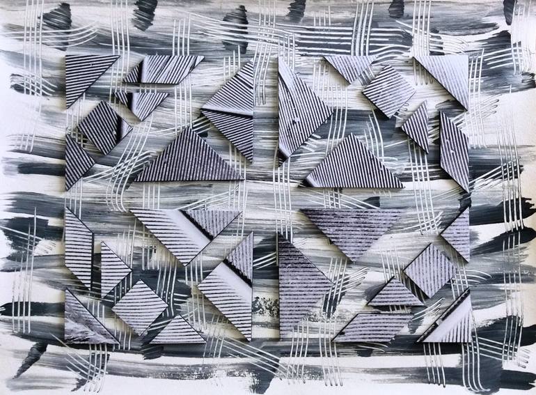 Pattern and texture as metaphor. Detailed original black and white photos, cut and mounted as 3-dmensional elements on watercolor background.