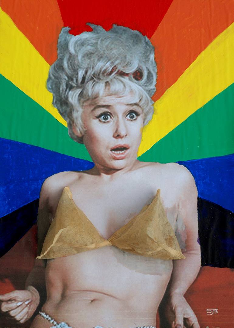 A tribute to the late Dame Barbara Windsor, the great acting and comedy talent. Collage of low resolution print, acrylic paint and tea bags. Designed to amuse and brighten up any household. The product is totally dried out and the tea leaves are free to move around in the bags.