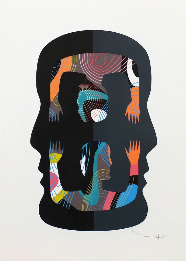 French contemporary artist, born in 1966, living in Nice. His protean work explores several techniques, collage, painting, photography, video, installations, inclusive works in virtual worlds. He never stops experimenting with new paths, constantly questioning himself. Tehos is particularly attracted by the links between language and art, beyond the simple aesthetic value of a work. He has many exhibitions to his credit. His works are exhibited and published in many countries. He designed the cover of the book "The legend of Bruno and Adèle" (Amir Gutfreund - Sapir Prize), one of the posters of the Salon Art Monaco 2014. The news paper Le monde diplomatique, illustrates its articles on several occasions with its works, in many countries. In 2020 his double heads are exhibited on more than 1000 screens (including several giant screens) in Dubai and Abu Dhabi. Several times awarded, he notably won the Aiap Unecso Jury Prize in December 2011 for his film Les Arbres cinétiques.