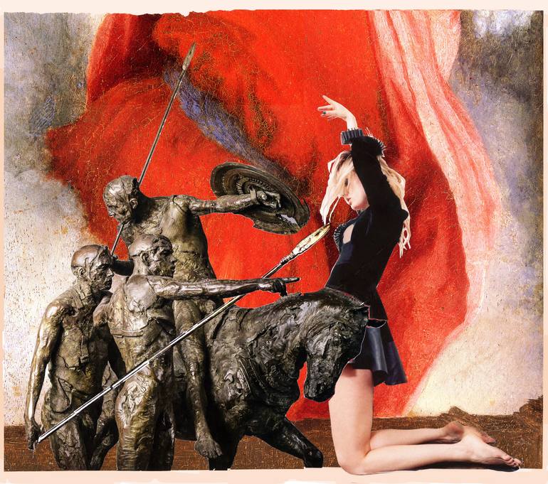 On a tormented red background evocative of conflicts, faced with the brutality of a group of powerful armed warriors and on horseback, opposes on their knees, with courage, the candid charm of a beautiful young woman ... Reinterpretation of the famous photo by Marc Riboud "La jeune fille à la fleur ...
