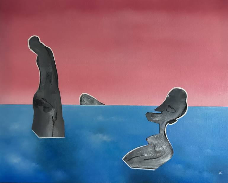 This worked is inspired by the surrealists, I wanted to paint different figures in the shape of rock formations that resemble statues floating on a sea of clouds.