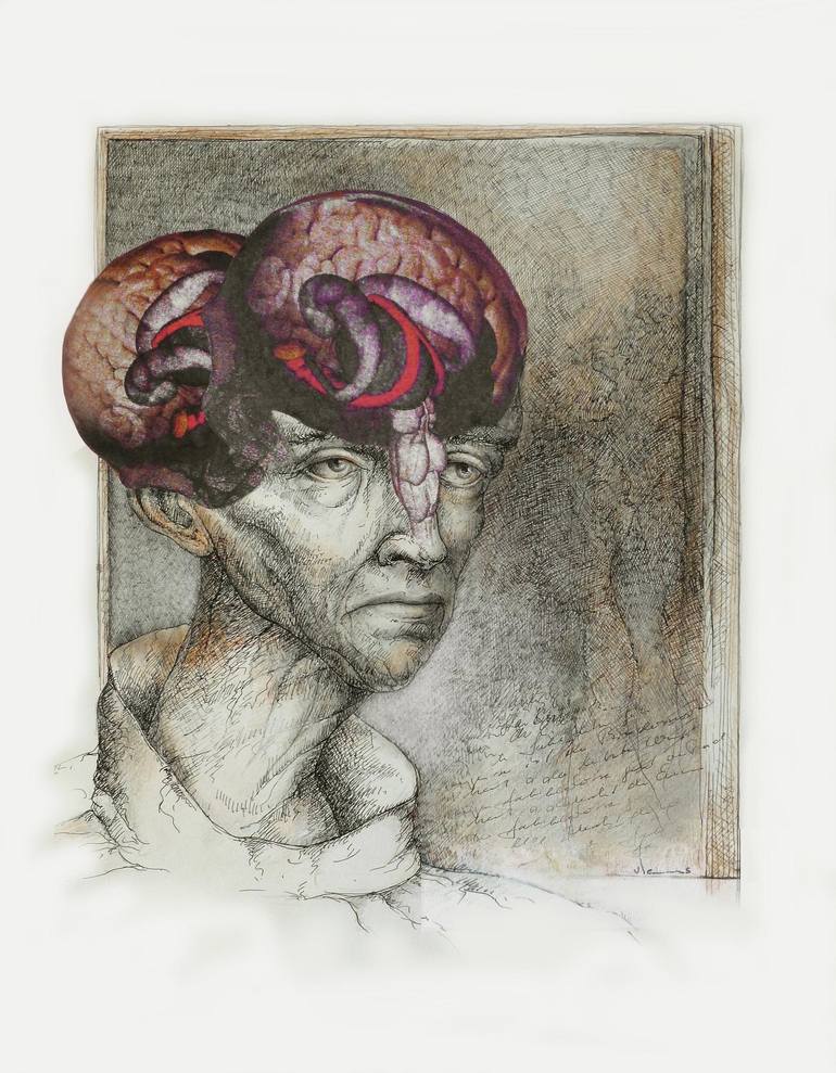 Born 1950 in Rotterdam NL. Of french-swiss nationality. Lives and works in the South of France. Essentially an abstract painter and sculptor, whose work is mainly to be found in arte povera and minimal art collections, the artists second area of interest is satirical drawing and collage in a realistic or surrealistic style. TRANS'CEREBRAL The works of the transCerebral series are a critical and satirical reflexion on the ambiguous role of the brain in our society. Far from being the simple instrument of rationality it is supposed to be, our brain often acts as undercover agent at the service of our most sordid instincts, sneakily substituting rationality by rationalisation. Metaphor of the schizophrenic condition of human intelligence, these images denounce the alarming discrepancy between our cognitive intelligence and our incapacity to transfer this knowledge into our social life. On the one hand, we are able to fly to Mars, to perform complex medical operations and to construct skyscrapers, bridges and any amount of lethal weapons. On the other hand, we are unable to master even our most basic instincts, and we seem to be wholly incapable to put our technical intelligence to intelligent, e.g. constructive use. This disparity may well prove the main difficulty in the merging of biological and artificial intelligence. Given the nano-mechanical means, it will doubtlessly be possible to boost our cognitive intelligence. But this operation might at the same time increase the gulf between technical and what we may call evolutionary intelligence - the capacity to use our trained brains to better the conditions of life on our planet - and leave us with even more highly knowledgeable and particularly destructive lunatics.