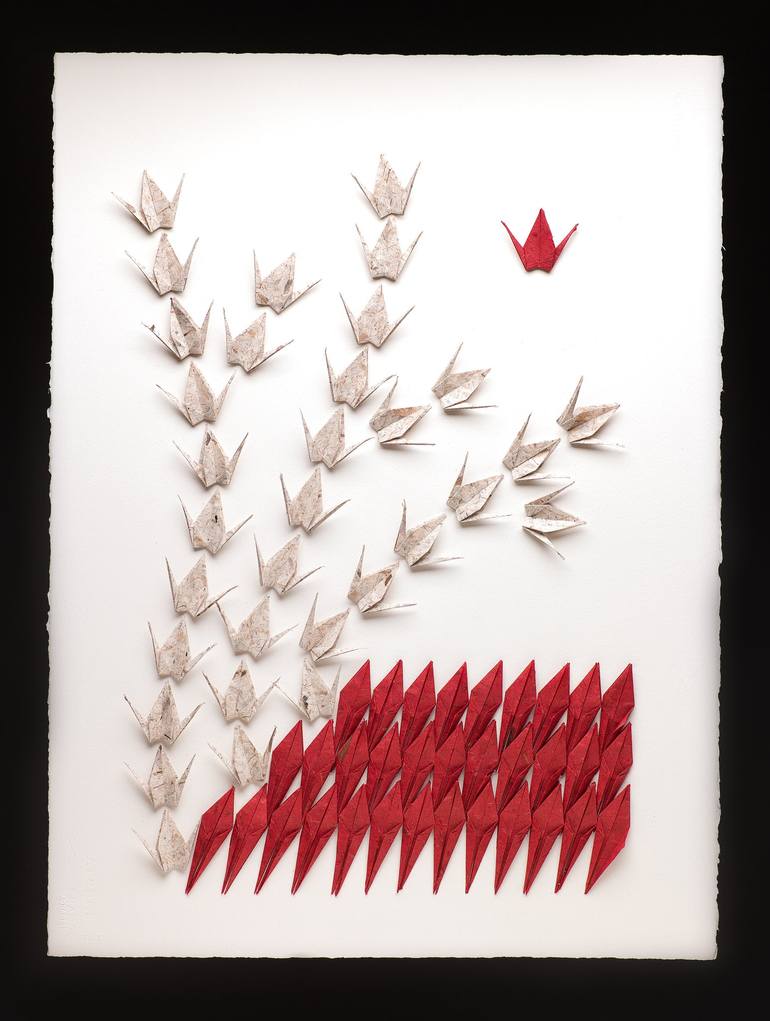 This is the third panel of the triptych Thirty Three. Automatic assault weapons were used to execute the 34 soldiers, who barely knew how to shoot and had no weapons to defend themselves. Around 1,570 bullet cases were found at the scene of the incident. Only one out of the 34 survived to tell ...
