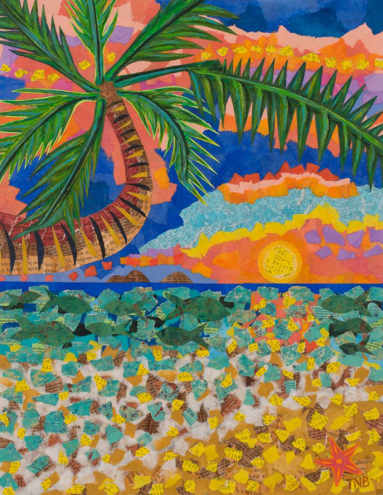 I love going to tropical places and watching the sunset. This was inspired by a visit to Hawaii. Collage with acrlic's on masonite.