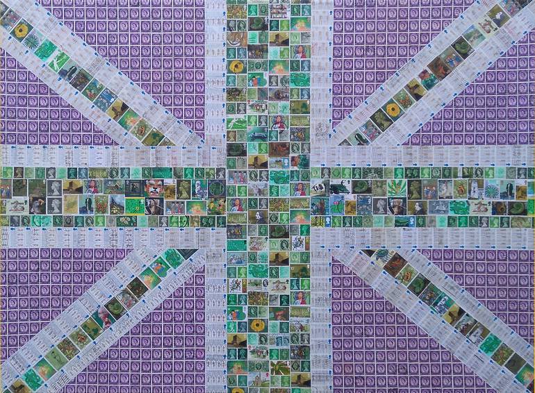 The Union Jack in Green and Purple British stamps, stuck onto canvas. The green stamps range from Victorian to modern day, with the background made out of 3d deep Lilac Wilding definitive, issued between 1953 to 1968. Finished off with a good coat of mat varnish.