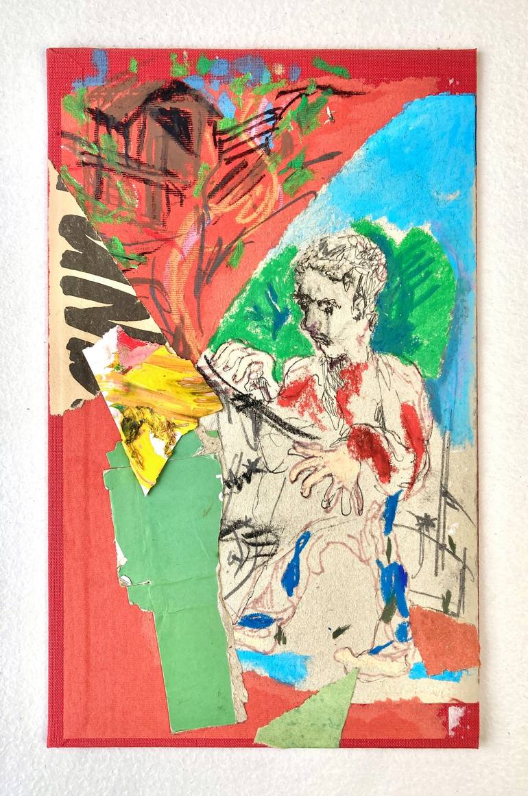 Handmade paper collage with gouache, chalk, oil pastel on discarded book cover