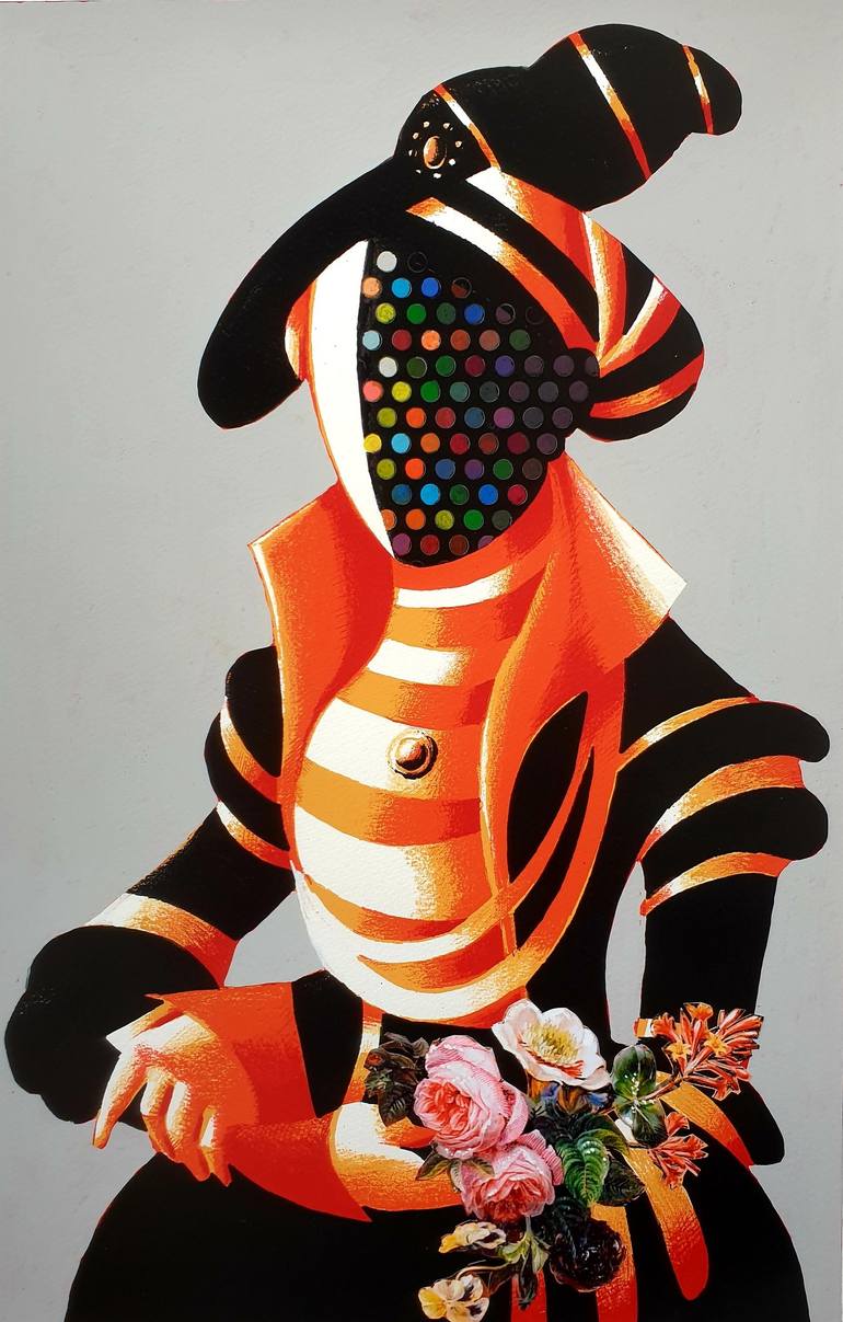 Sobre una serigrafia de cuatro colores de mancha 38 x 49,8 cm sobre papel ( Guarro Super alfa ) de 48 x 69,5 cm realizada en el año 2002. Se han realizado collage, alteraciones de color con gouache, lápices de colores.... Con estas variaciones se consigue una obra nueva que ensalza...