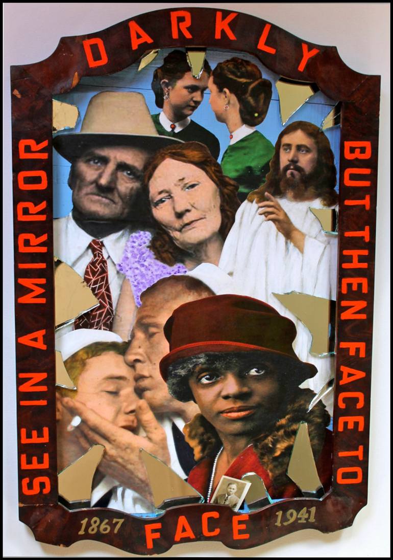WHAT THE MIRROR SAW (1867-1941) is a mixed media work, 32x20x2, from award-winning artitst Peter J. Ketchum. Made with a broken mirror (I broke it by accident) and shards of the mirror glass. I added found b&w photos which were enlarged, cut out (exacto knife) and colored with photo dyes, acrylics, ...