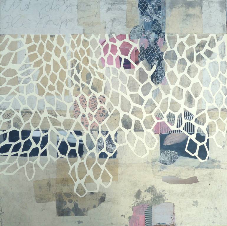 Paper, Paint, Acrylic, and Graphite on Canvas. This collage on canvas is framed in an off white light weight wooden box frame that I handpainted with acrylic paint. To create my collage paintings I works with different kinds of paper and acrylic paint. My work for me represents the process of ever...