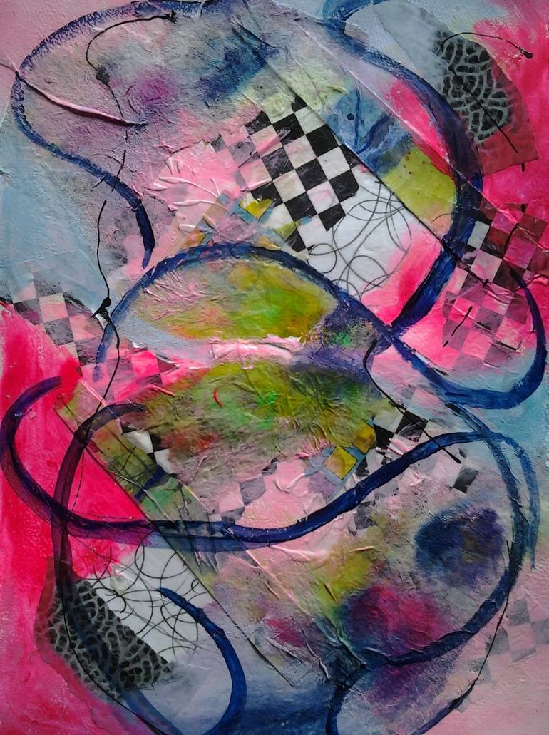 Artwork Titled What's Not To Love is a playful mixed media piece.Having passages that flow and rhythm crossing paths in this colorful abstract created in moving line and pattern some handmade carrying your eye all around the painting always something to see. A Pure abstract Lovers’ attraction.