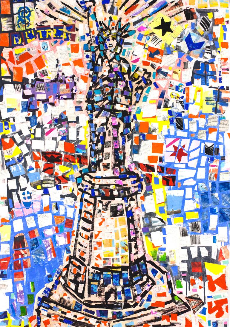 Mosaic Collage 2018 different colors: acrylic, gouache, ink... - paper fragments: painting, drawing on paper/newspaper - photography, digital pieces - collaged with wood glue on kraft paper. Mosaic-collage is protected with a thin acrylic varnish, signed/dated at the back. Artwork needs to be fra...