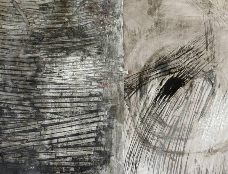 mixed media on paper. the left side is a pattern created with text strips from a Latin-German dictionary and black gesso. the right side holds marks I made with gesso, oil and ink on the back side of an art print. an exploration of patterns, inspired by the process of speech production: from all th...