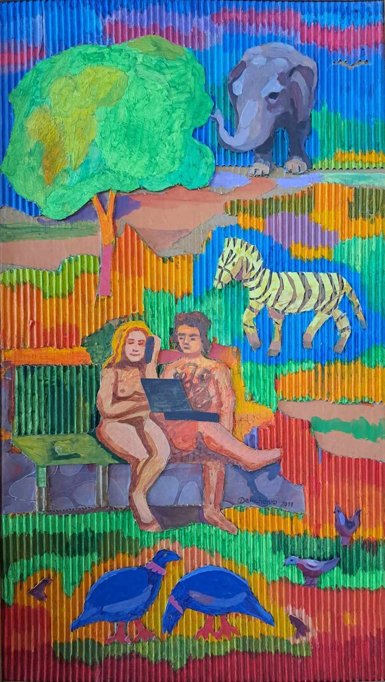 Lesya Demchenko was born in Kiev (Ukraine) 1974. She finished state art school in Kiev. She studied at academy of fine arts in Perugia (İtaly). From 1998 leaves in Turkey. She opened 14 personal exhibitions in Turkey, and 2 in Germany, 2 in Ukraine In 2022, she graduated from the Department of Graphic Design at Kirklareli University in Turkey and the Department of Public Relations at Anadolu University in Turkey. She takes part in different group exhibitions, festivals, art gatherings, in Turkey and abroad, holds many workshops and master classes. She is appreciated by many critics, gallerists, collectors. The most interesting thing about Demchenko’s art is, of course, ‘Cartonage’ technique. Material which is used for it is corrugated carboard, which is cut, painted, glued. And other pieces of paper are glued on it. But it is not what we used to call collage, the main joke is, how inside part of the cardboard is used. İ mean waves inside corrugated cardboard, which from the distance look like stripes of colour. Cartonage pictures are very rich, because of variety of possibilities, its colours, and of course originality. She also creates digital animations and videos for her YouTube channel, featuring corrugated cardboard as the main character.