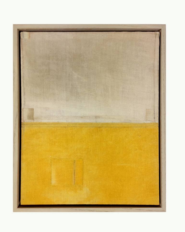 Collaged from vintage cloth bound book covers. Framed measurements 28 x 23cm The marks and fading that have occured over time are integral to the finished piece. Float mounted in an open 3.5 cm white washed wooden box frame, no glass. strung on the back. hang out of direct sunlight in a dry env...