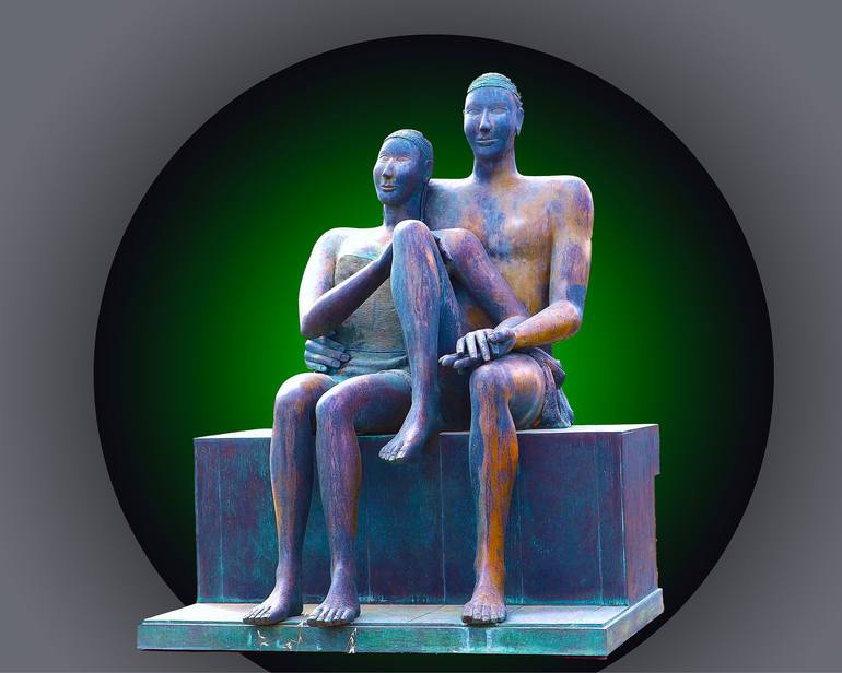 Two abstract figures are seated on a block, with one figure holding the other gently. The background is a gradient of green fading into gray, highlighting the sculpture. Available as a Limited Edition of 25 fine Prints on Metal H 60 x W 75cm $ 800 + Shipping. All limited-edition prints are accompa...