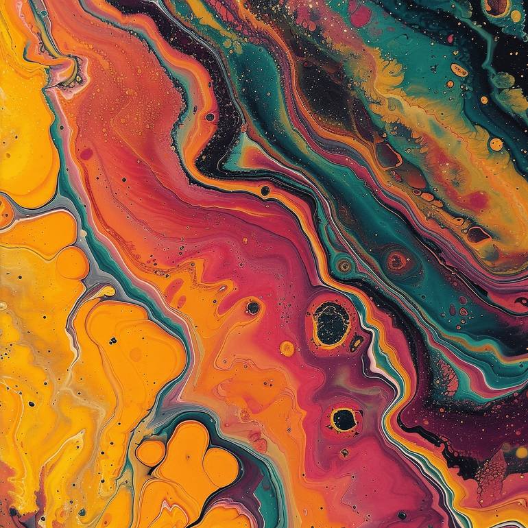 The fluid art depicted here showcases an organic flow of vibrant yellows, rich reds, and deep turquoise, creating a bold and dynamic visual journey. The interplay of colors and forms suggests geological strata, lava flows meeting ocean tides, or even the swirling atmospheres of distant planets, all ...