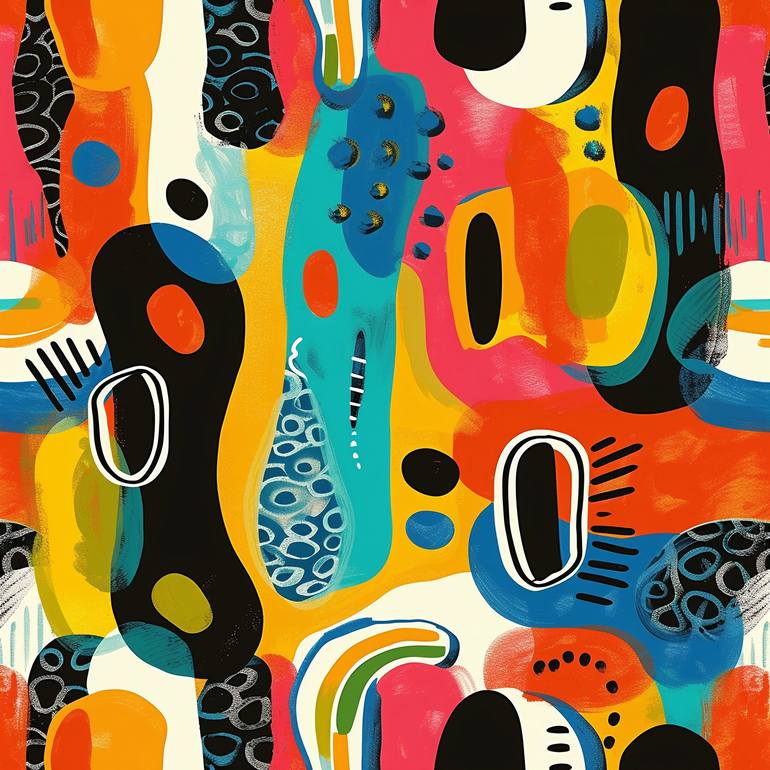This abstract composition features an organic confluence of shapes and forms, painted in a vibrant palette that spans warm yellows, deep blues, and lively reds. The playful arrangement of elements, adorned with patterns and surrounded by bold black outlines, evokes a sense of whimsical spontaneity r...