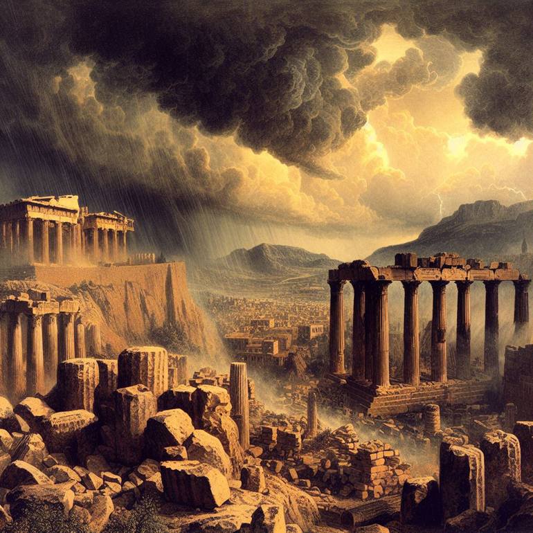 A thematic AI generated image in gravure style and colorization, with a superb compilation of ancient greek urban sceneries through the passing of the day. Part 30 of a series of 50 under this theme.