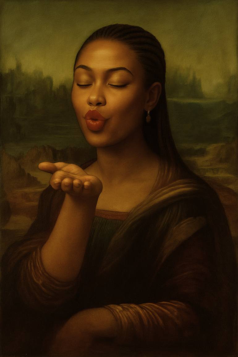 Part of Jafeth Moiane’s collectible “Afro Mona Collection”. Kiss of Harmony transforms da Vinci’s iconic muse into a symbol of love, peace and modern Afrocentric beauty. With her eyes closed and lips softly blowing a kiss, she embodies serenity and affection. A portrait of emotional grace and inn...
