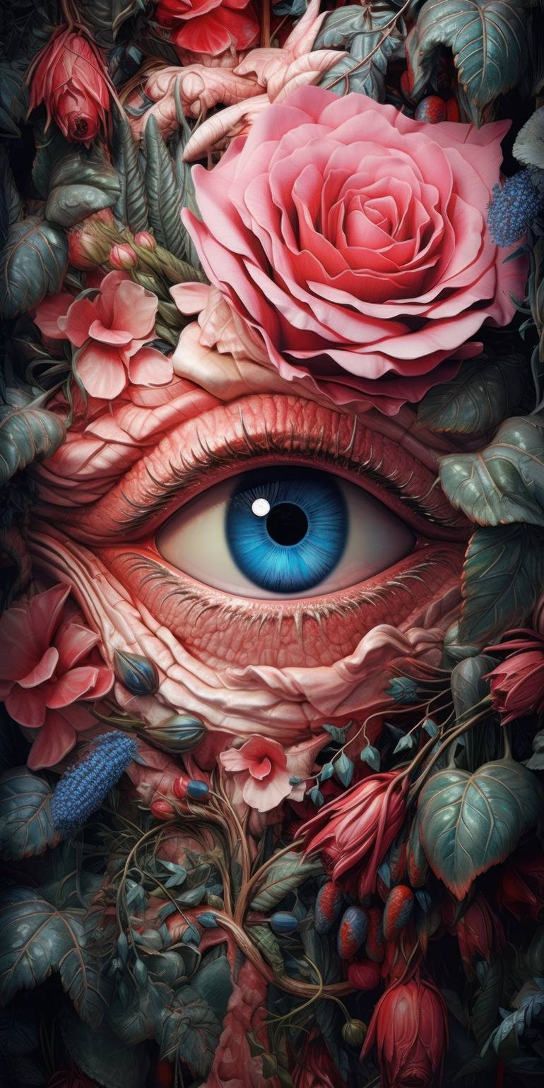 This mesmerizing artwork in the world of Sattchiart showcases an exquisite illustration of an eye gracefully encircled by a captivating arrangement of roses and pink carnations. The delicate petals and vibrant colors create a visually enchanting composition that captures the viewer's attention and i...