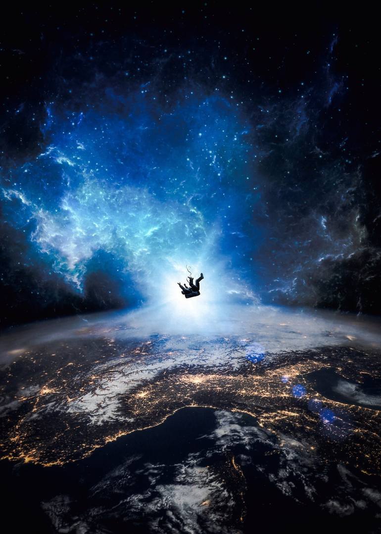 In a universe of blue galaxies, the silhouette of an astronaut on a mission for NASA falls gently towards planet Earth. But what's happened? Where's his rocket? What drama has unfolded in this infinite space?