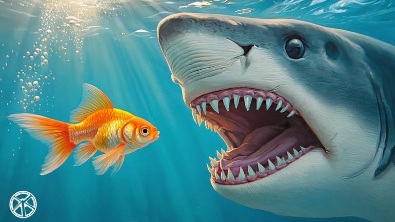 A dramatic Baroque style oil painting capturing a goldfish moments before being devoured by a ferocious shark. With moody lighting, rich texture, and intense contrast, the piece explores themes of survival, illusion of safety, and the brutal beauty of nature. It evokes tension and awe—an allegory of...