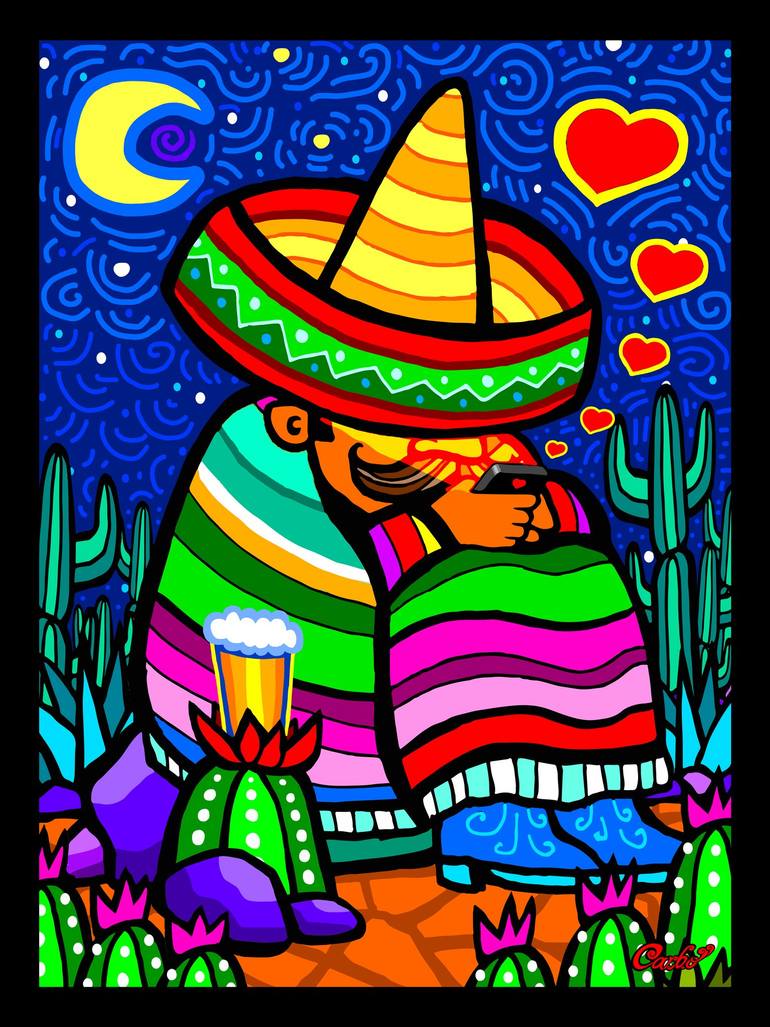 Mexican Pop Art style charrito character on a cel phone with a sarape at night drinking a beer and sending love texts.