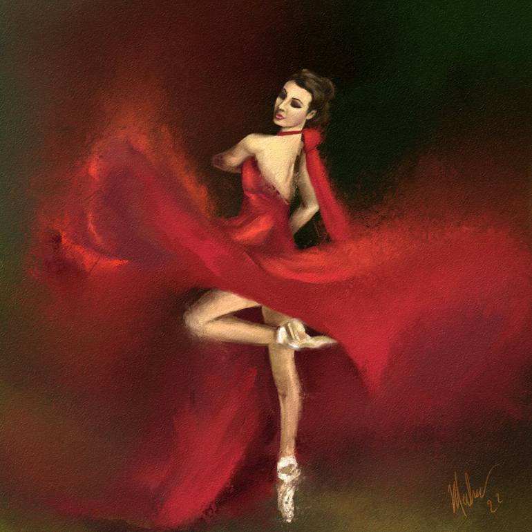 This digital painting portrays a ballerina in a red dress, gracefully dancing against a green background. The dress flows dynamically across the canvas, capturing the elegant movement and poise of the ballerina, and creating a vivid contrast that highlights the dancer's form and fluidity. Inspirati...