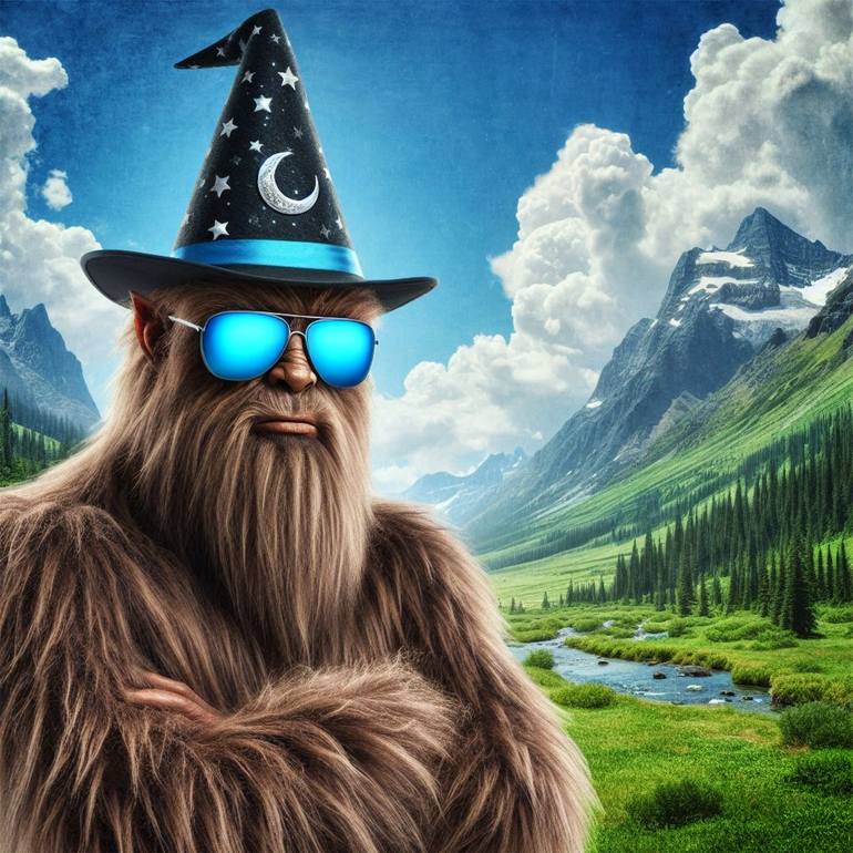A Bigfoot dressed in a wizard hat and sunglasses stands confidently in a lush mountain valley. The sky is vibrant with fluffy clouds, adding a magical touch.
