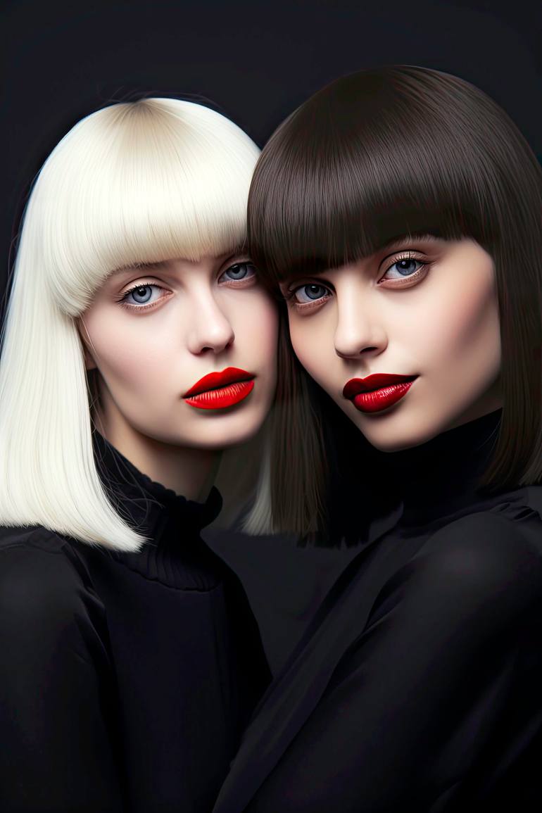 Against a dark gray background, an elegant composition features two captivating women in sophisticated black blouses. One is a brunette with flowing dark hair, the other a blonde, and both are united by bold red lipstick, adding a touch of refined drama and sophistication to the overall scene.