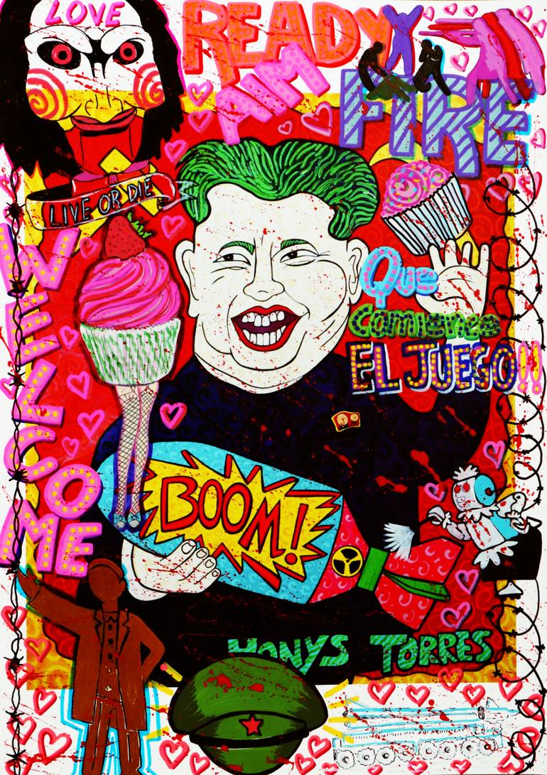 Boom Digital collage, 2025 – Honys Torres Boom is a pop explosion that denounces the constant nuclear threat posed by North Korean dictator Kim Jong-un. With an exaggerated grin and cartoonish green hair, the leader holds a blast marked with a nuclear symbol, as if destruction were a game. The ph...