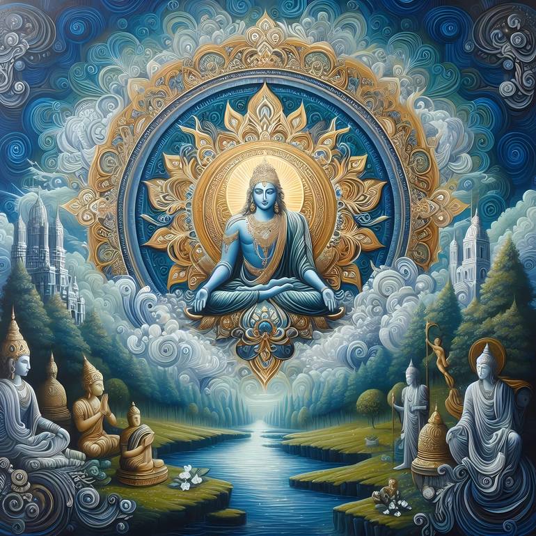 The image depicts a serene and spiritual scene featuring a variety of figures, including Buddhas, in a dreamlike setting with a river and lush greenery.