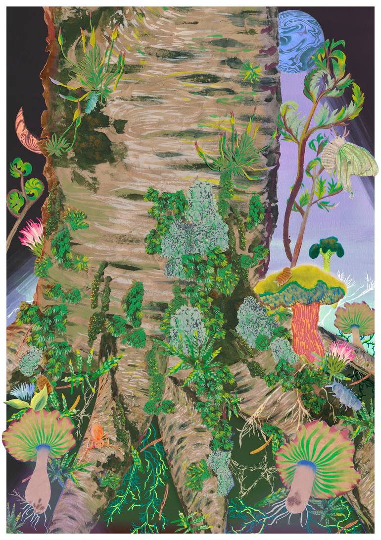 Two moons shine around this beech tree, casting light on moss, insects and fluorescent fungi