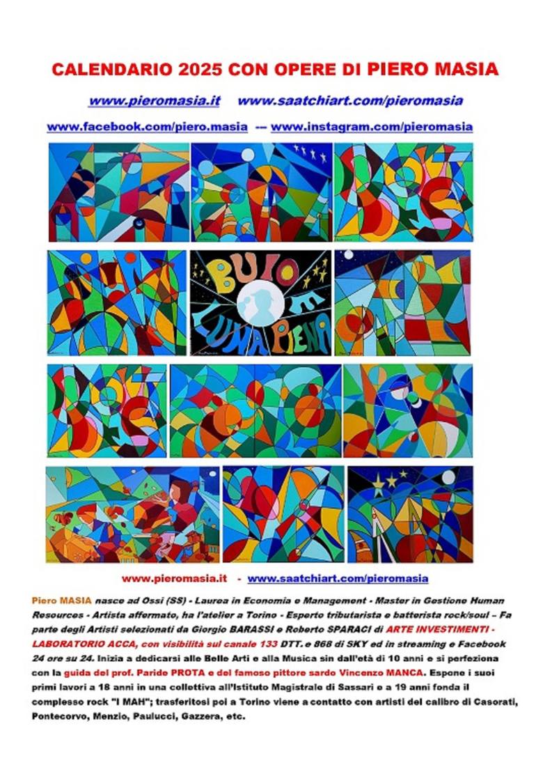 BIOGRAFIA: Piero Masìa nasce ad Ossi (SS) - Laurea in Economia e Management - Master in Gestione Human Resources - Artista affermato, ha l'atelier a Torino - Esperto tributarista e batterista rock/soul – Fa parte degli Artisti selezionati da Giorgio BARASSI e Roberto SPARACI di ARTE INVESTIMENTI/LABORATORIO ACCA, con visibilità su canale 123 D.T. e canale 868 di SKY ed in streaming e Facebook 24 ore su 24. .masia - Inizia a dedicarsi alle Belle Arti e alla Musica sin dall’età di 10 anni e si perfeziona con la guida del prof. Paride PROTA e del famoso pittore sardo Vincenzo MANCA. Espone i suoi primi lavori a 18 anni in una collettiva all’Istituto Magistrale di Sassari e a 19 anni fonda il complesso rock "I MAH"; trasferitosi poi a Torino viene a contatto con artisti del calibro di Casorati, Pontecorvo, Menzio, Paulucci, Gazzera, etc. Nel 1974 fonda a Torino, con altri tre artisti, il Circolo Artistico “Il Pennellaccio”, associazione senza scopi di lucro e con finalità culturali; nel 1979 ne diviene Presidente ed organizza sino al 1990 molte manifestazioni culturali con la partecipazione di grossi esponenti dell’Arte Torinese e con il patrocinio del Comune di Torino e della Regione Piemonte. Nel 1999 fonda ed organizza sino a tutt’oggi, la Galleria d’Arte Virtuale Artecity, sito web che conta diversi artisti di tutto il mondo ed aperto a tutti gli artisti che dedicano la loro vita alla divulgazione dell’Arte, intesa come valori di vita, cultura ed espressione dell’Uomo. Nel contempo non tralascia la sua grande passione per l’Arte ed espone sin dal 1974 a tutt'oggi in varie personali e collettive (in Italia ed all'Estero), sempre su invito. Mostre Personali: 1974: Palazzo Baronale – OSSI (SS) - 1976: Palazzo Chiablese - Torino - 1978: Palazzo Baronale - Ossi (SS) - 1978: Galleria La Clessidra - Torino - 1979: Saletta Arte - Piacenza -1979: Galleria Arte - Porte/Pinerolo - 1980: Palazzo Baronale – Ossi (SS) - 1982: Saletta espositiva - Alghero - 1983: Palazzo Chiablese - Torino - 1984: Palazzo Municipale – Codrongianos (SS) - 1984: Saletta espositiva - Ittiri (SS) - 1985: Palazzo Chiablese - Torino - 1986: Palazzo Baronale – Ossi (SS) - 1990: Palazzo Chiablese - Torino - 1994: Palazzo Baronale – Ossi (SS) - 1996: Circolo Ufficiali - Torino - 1998: Circolo Ufficiali - Torino.