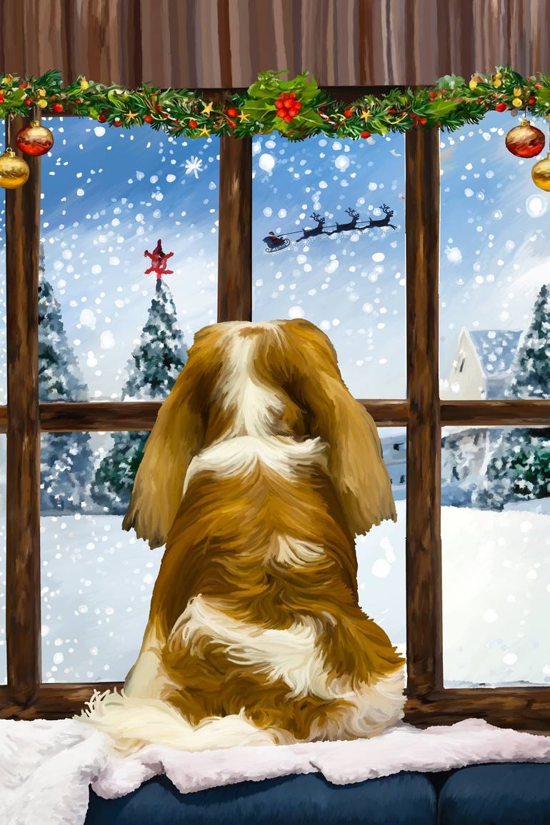 Capture the peaceful magic of the holiday season with this hand-painted digital art featuring a Cavalier King Charles gazing out a window at a snowy, beautifully decorated Christmas street. The Cavalier and the snow falling outside create a cozy, festive atmosphere that’s perfect for the season All...