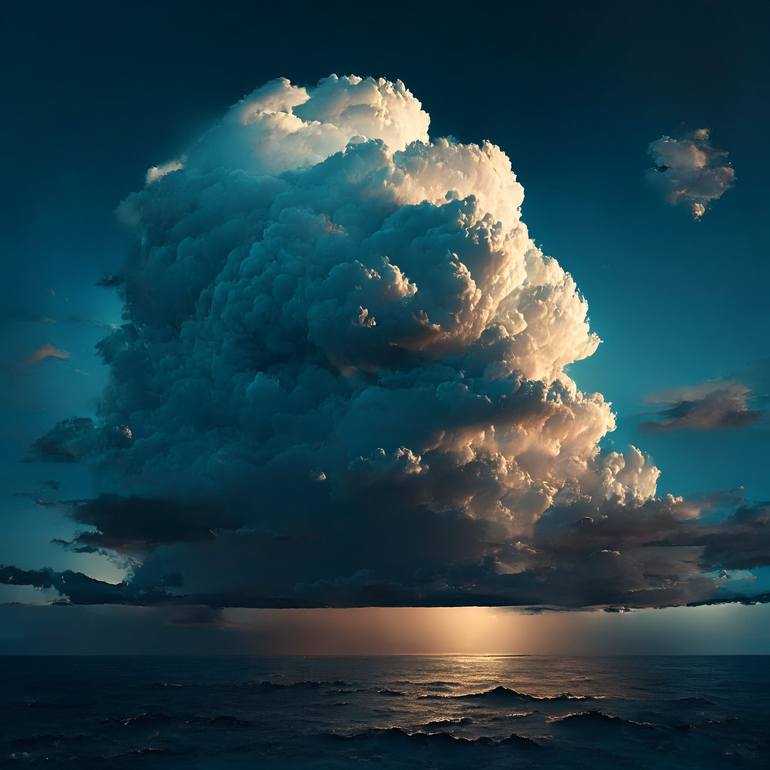 Behold the breathtaking spectacle of nature's theater as it unfolds above the expansive canvas of the ocean. In this interesting image, the sky comes alive with the grandeur of cumulus clouds, their majestic forms hinting at the potential for a dramatic thunderstorm. As the day draws to a close, th...